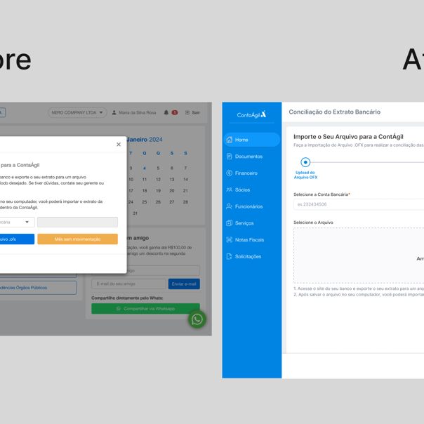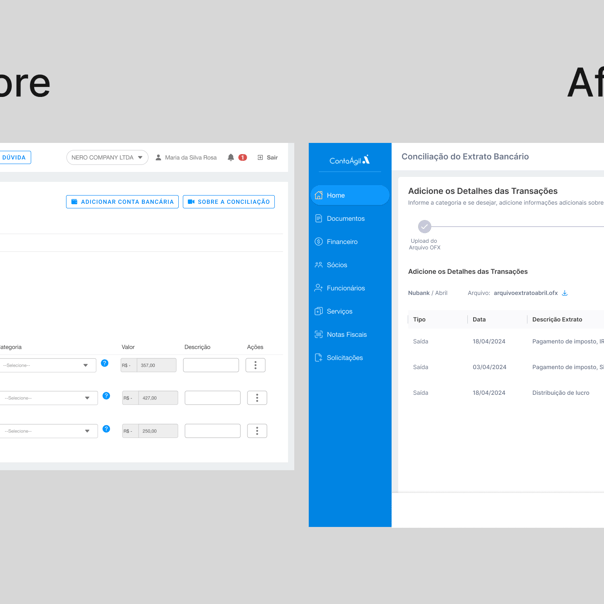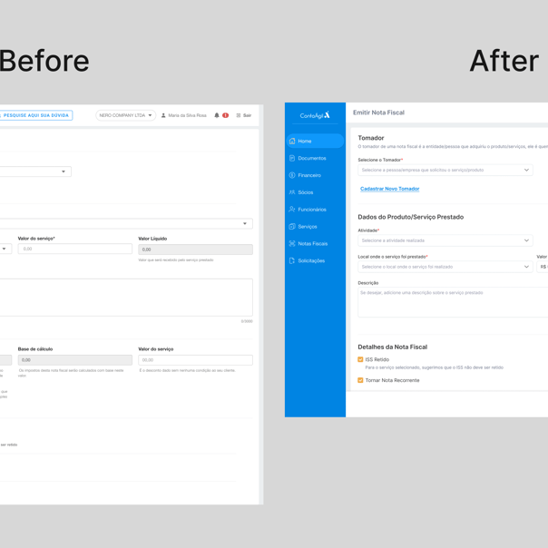 As part of my Postgraduate degree in User Experience, I conducted a heuristic analysis of "ContÁgil," a Brazilian accounting platform from a startup. I began by consulting with the company owner to understand the main issues users were facing, which were based on complaints and support requests. From this feedback, I selected two workflows to focus on: the process of issuing invoices and reconciling bank statements for accounting purposes. I analyzed each step in these workflows, identifying areas for improvement using Nielsen's heuristics. In addition to reworking the product’s structure, I also created a new UI to enhance the overall user experience and visual design.